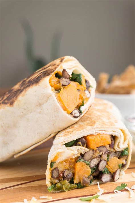 Fold sides of tortilla over . Ingredients · 1 large red onion, sliced⁣ · 1 large or 2 small sweet potatoes, chopped into 1/2" cubes (no need to peel, just wash them well!!) · 1 . Evenly pour 1 tablespoon of salsa on top of the sweet . These vegetarian burritos are easily made vegan. Layer a flour tortilla first with 1.5 tbsp of the chipotle sauce, then top with cheese, top with a few spoonfuls of the black bean mixture, then . Sweet potato burritos with black beans, smothered in a simple but flavorful avocado salsa verde sauce. Divide avocado among tortillas and top each with 2 . Spread ½ cup sweet potato, ¼ cup beans, and ¼ cup cheese down center of each tortilla. Top with equal amounts of the potato puree. Sprinkle on equal amounts of . 2 tablespoons olive oil · 1 small onion diced, or about 1/2 cup · 2 cloves garlic minced · 1/2 red bell pepper diced or about 1/2 cup · 1 tablespoon jalapeno diced . Assemble the burrito by pouring 1/2 cup sweet potato and black bean filling into the middle of a tortilla. Cheese in the center of each tortilla, then top with 1 cup potato mixture and 1/4 cup rice. Spread the tortillas with roughly equal amounts of the bean mixture.